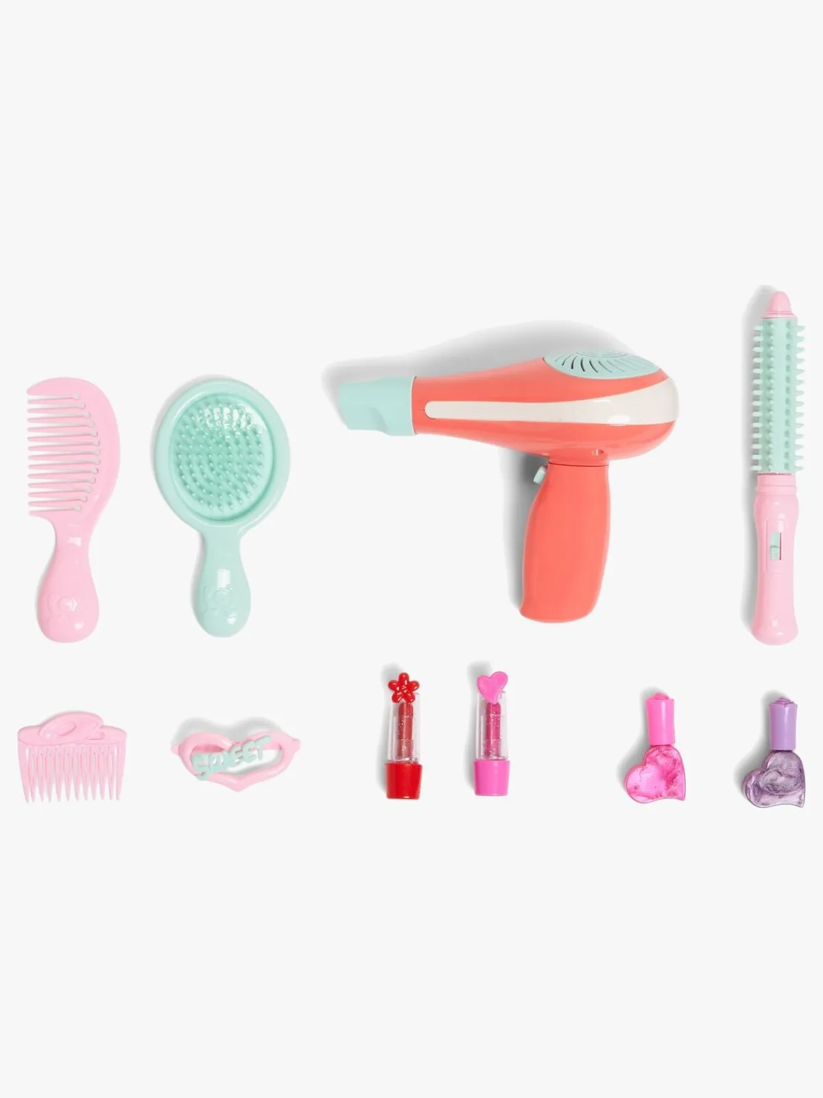 – 2 neglelak, 2 læbestifter, 2 børster, 2 hårspænder, 1 hårtørrer, 2 curlers.