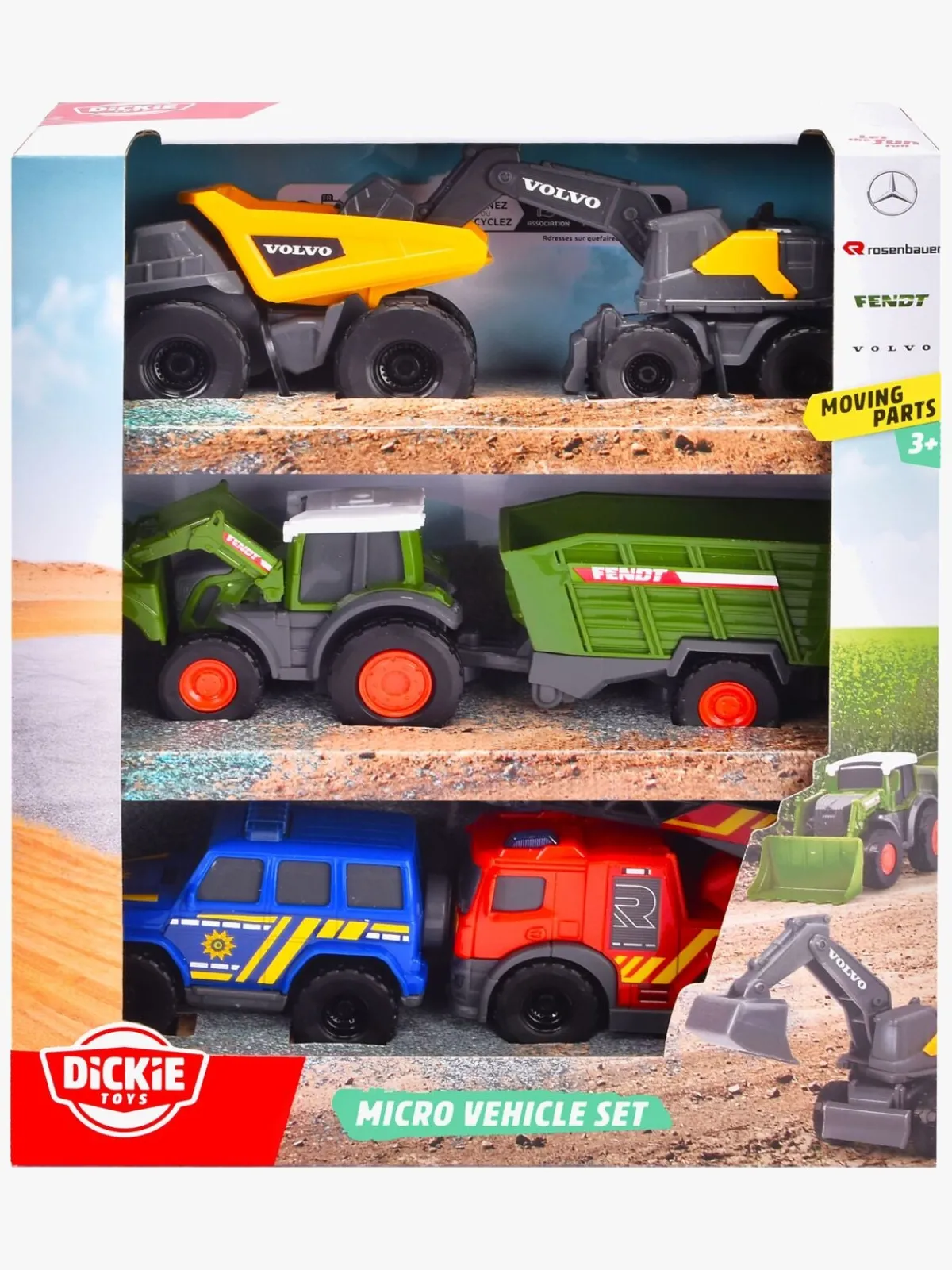 – Indeholder: 1 dumper, 1 gravko, 1 traktor, 1 anhængervogn, 1 politibil, 1 brandbil.