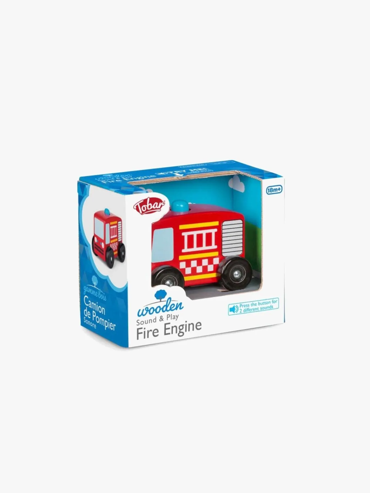 Bilen er fremstillet af træ og har bevægelige træhjul, der gør, at den kan køre rundt og tages med på eventyr. Bilen giver lyd fra sig, når man trykker på knappen, der sidder på toppen af brandbilen.