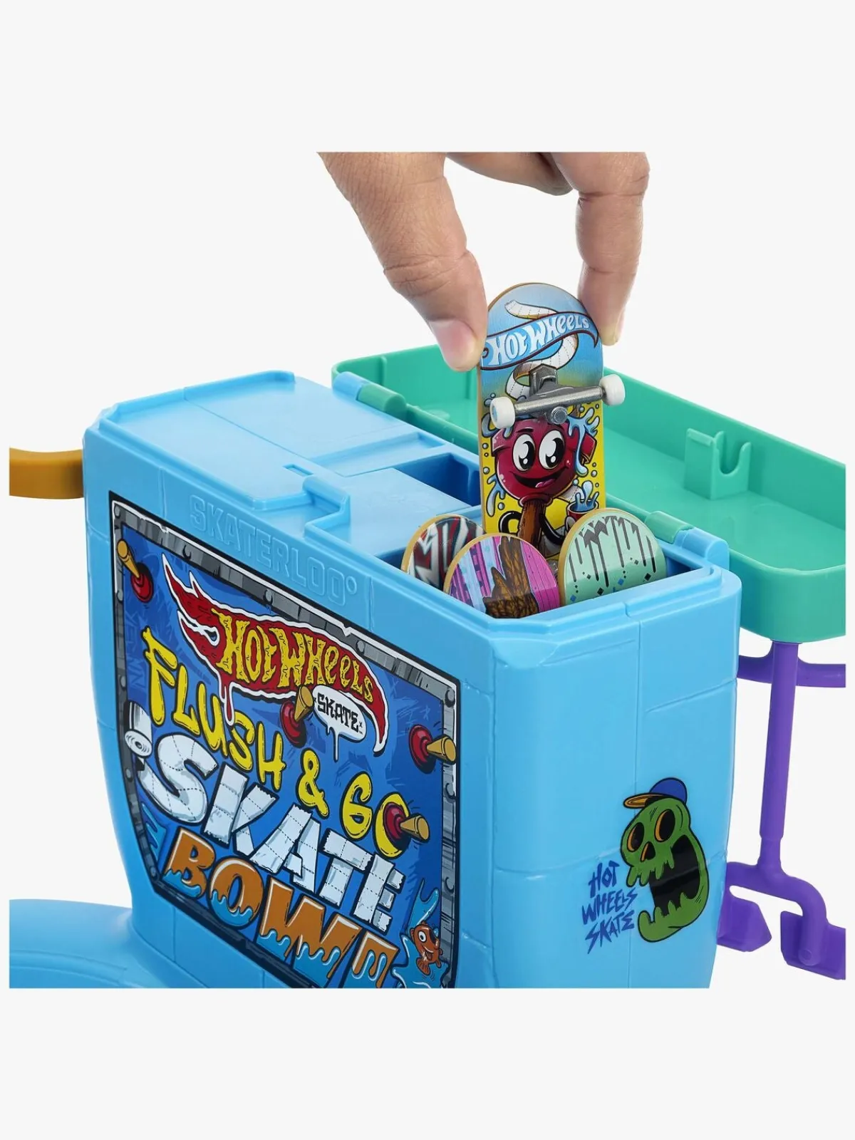 – Opbevar det medfølgende fingerskateboard i tanken og tryk derefter på skylleknappen for at slippe det ned i kummen og begynde at køre.