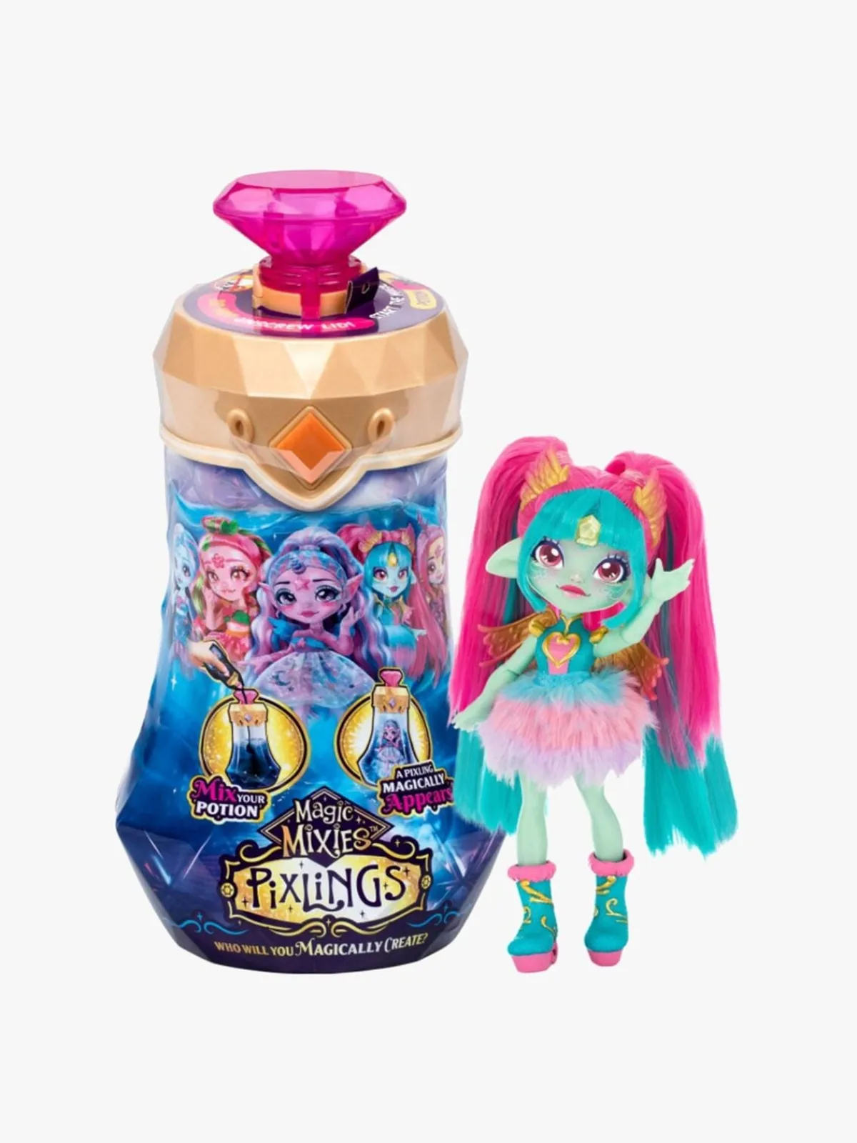 – Tilsæt de magiske ingredienser, sig de magiske ord og se din Pixling-dukke på magisk vis komme frem i flasken.