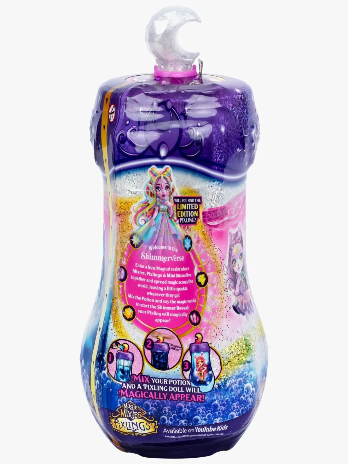 – Tilsæt de magiske ingredienser, sig de magiske ord og se din Pixling-dukke på magisk vis komme frem i flasken.