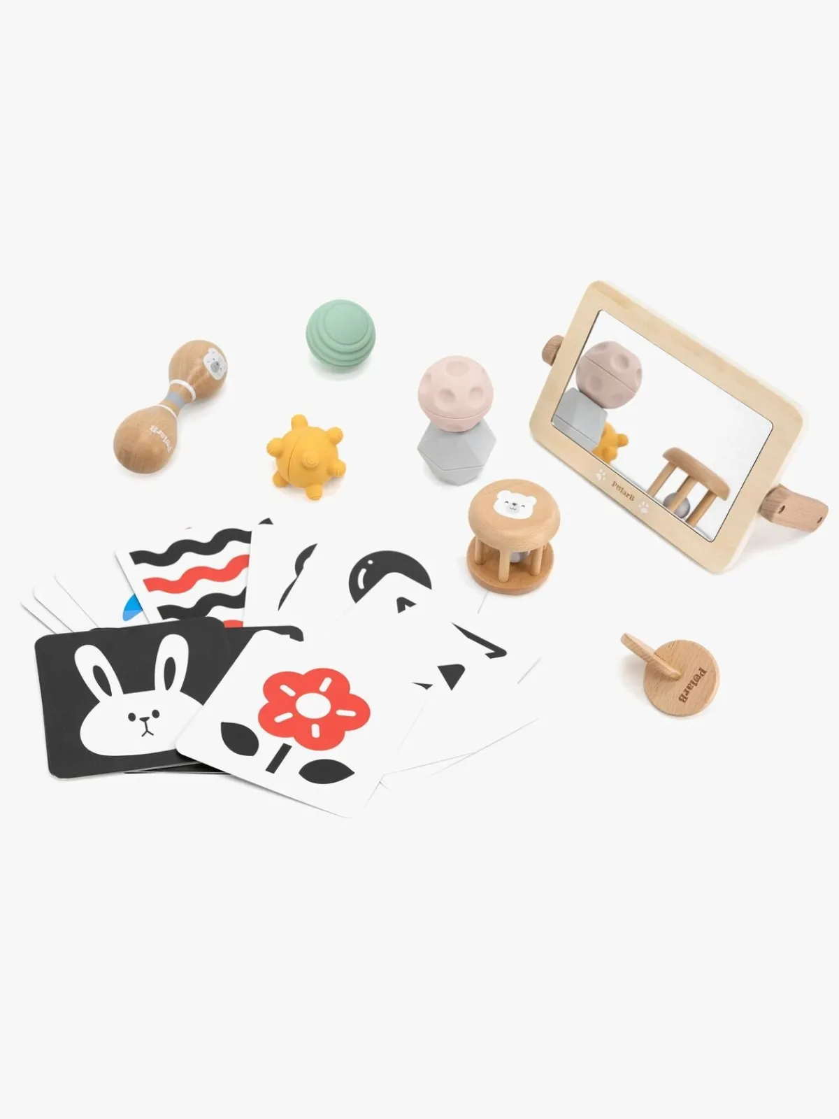 – Indeholder: 20 høj kontrast-kort, 1 spejl, 1 rangle, 2 maracaer, 2 sammenkoblede skiver, 4 aktivitetsbolde.