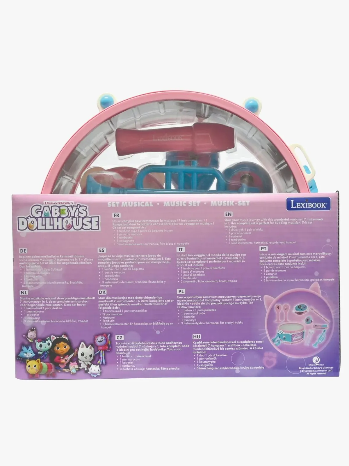 – Indeholder: 1 tromme, 2 maracaer, 1 kastagnetter, 1 tamburin, 1 mundharmonika, 1 blokfløjte, 1 trompet.