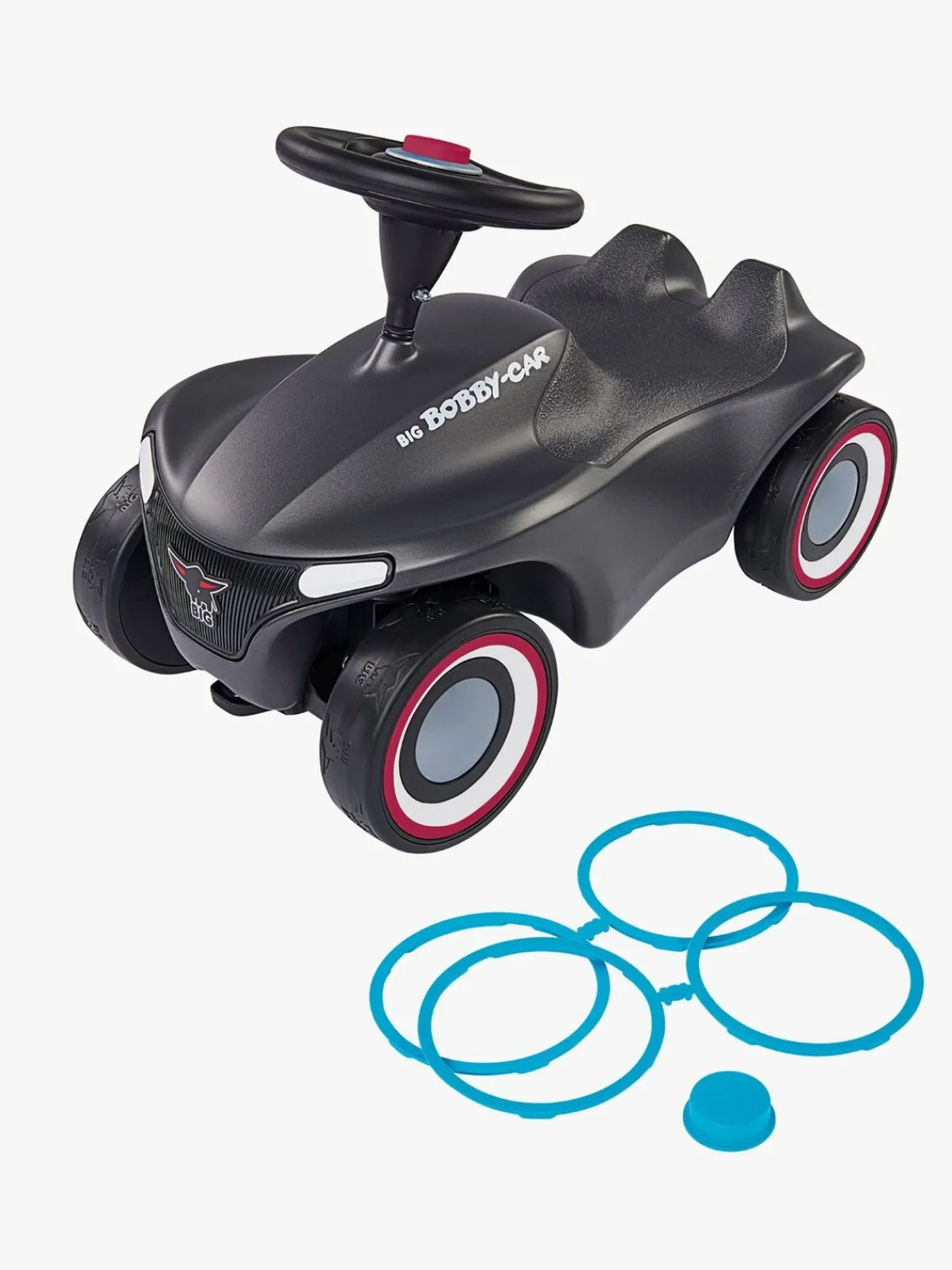 Tilbehør til horn og hjul indgår. Du kan let bytte disse detaljer ud fra blå til rød farve.