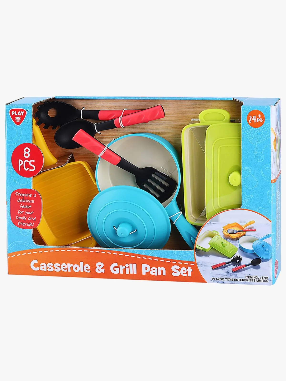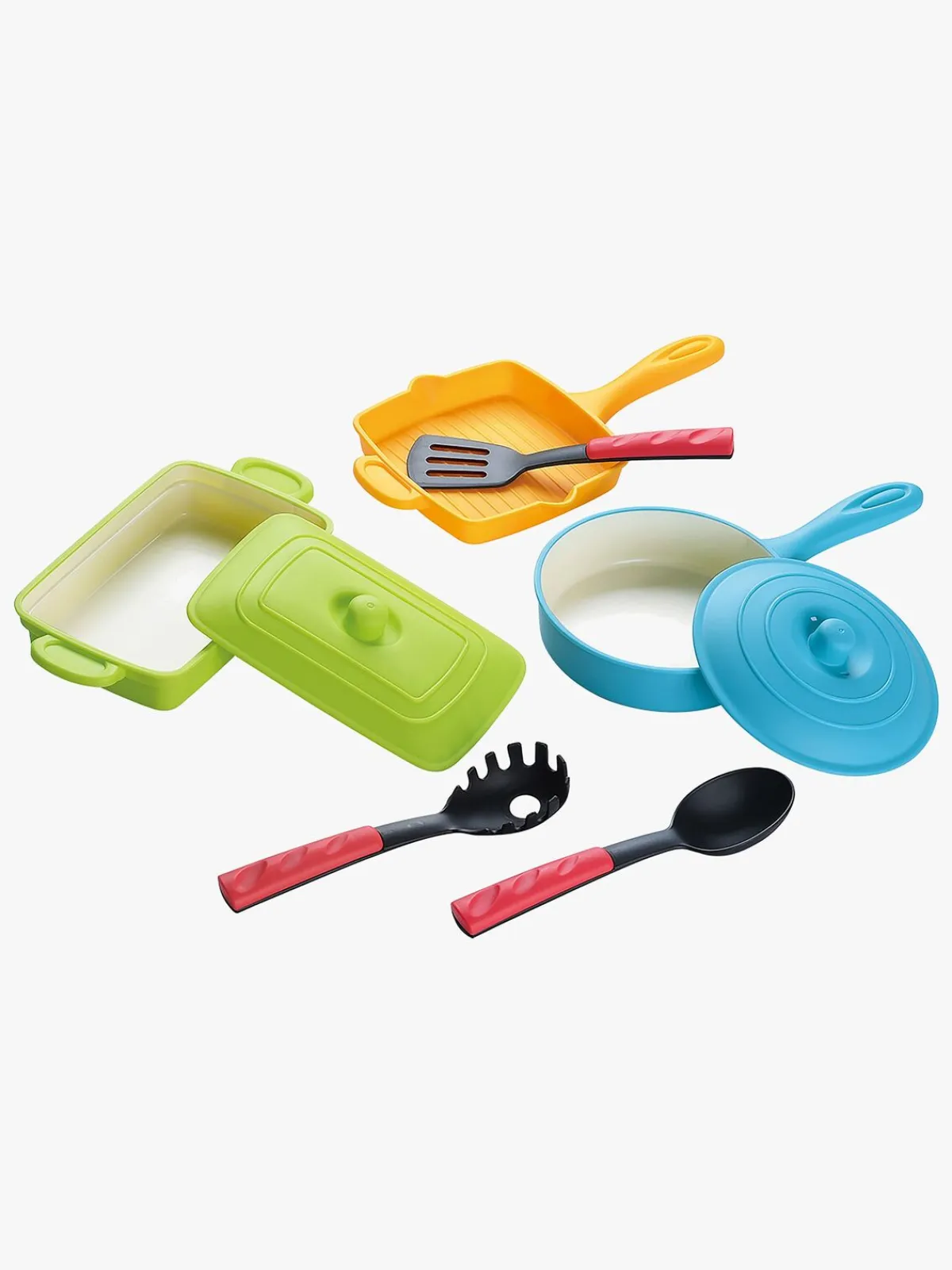 – Indeholder et ovnfast fad med låg, en stegepande, en grillpande og tre forskellige køkkenredskaber.