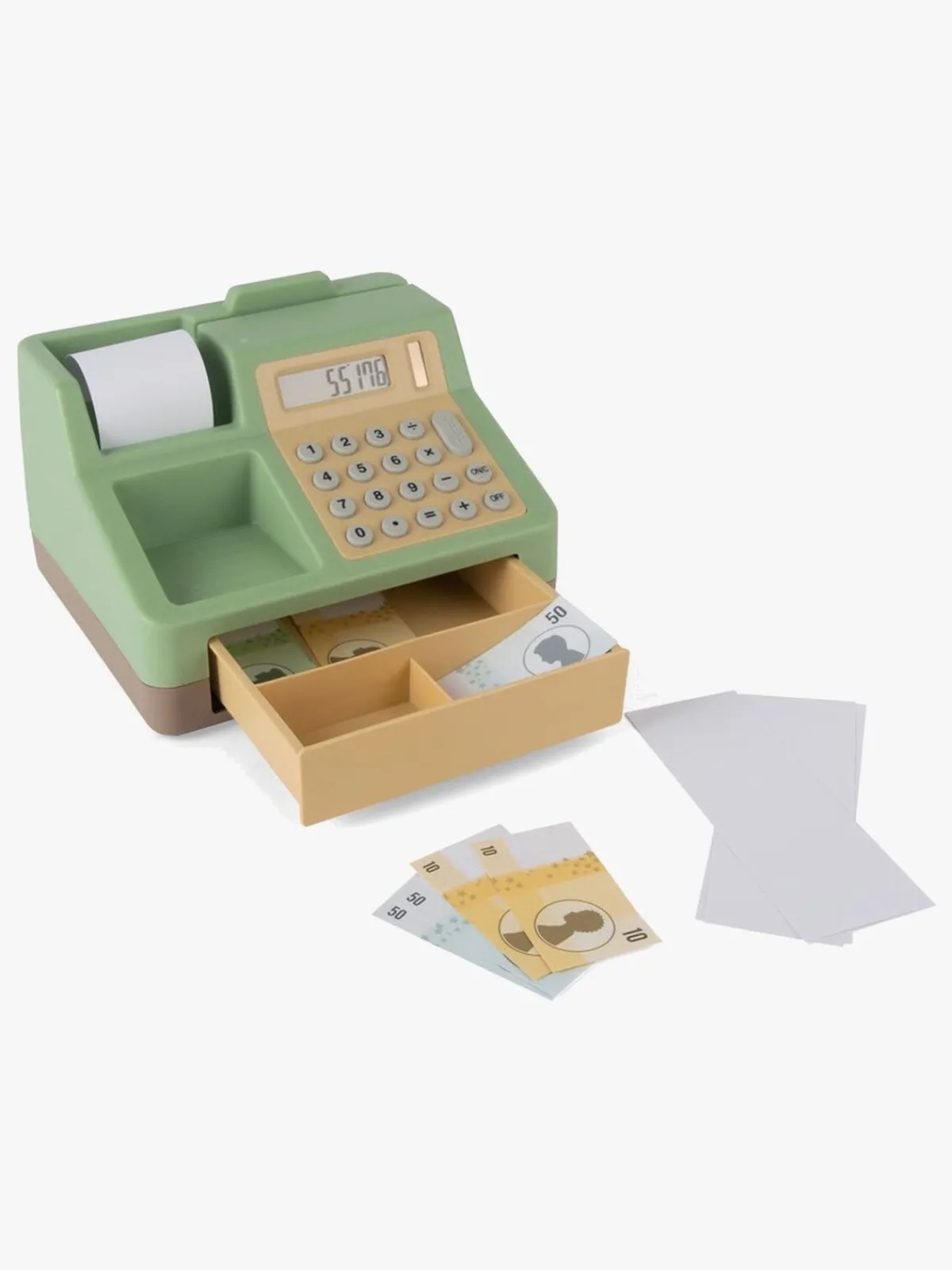 – Indeholder: kasseapparat, solcelledrevet lommeregner, papirpenge og kvitteringer.