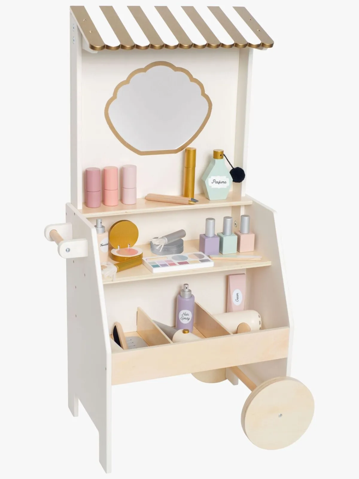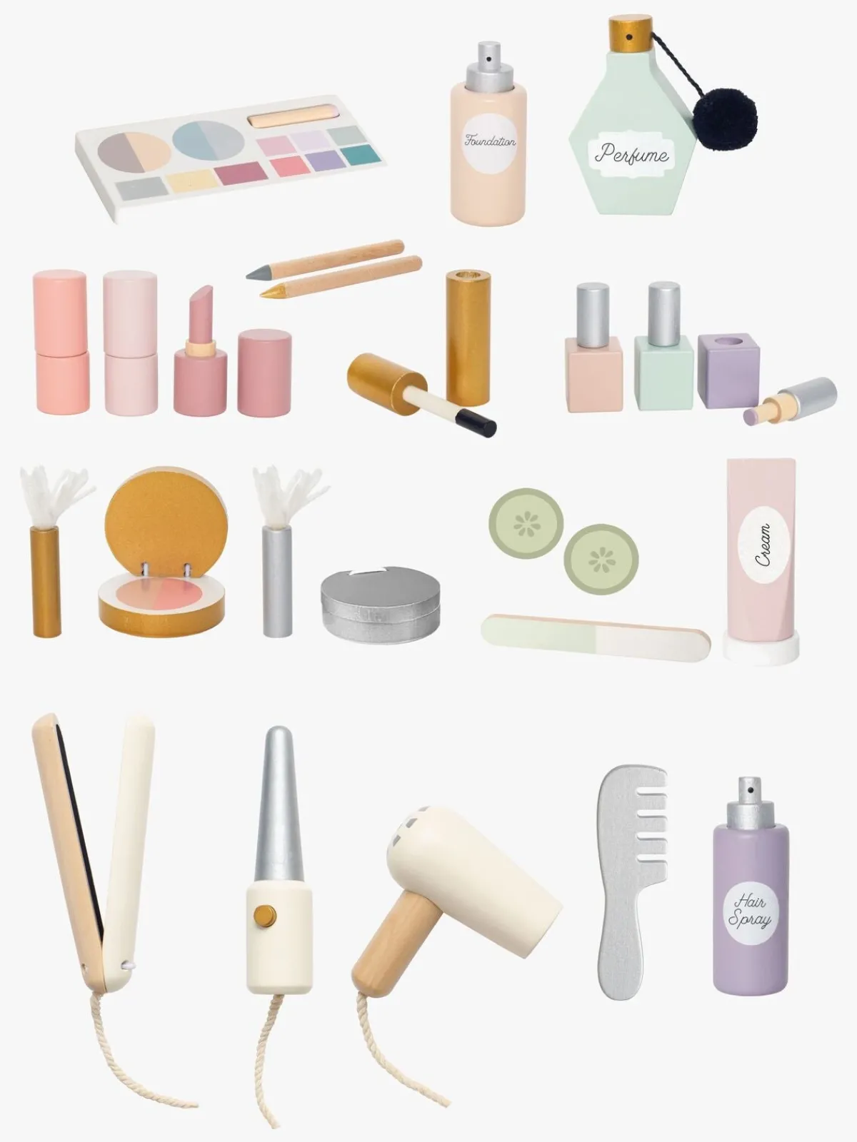 – Indeholder: 1 skønhedssalon, 1 spejl, 1 kam, 1 hårtørrer, 1 fladjern, 1 krøllejern, 1 hårspray, 8 makeupprodukter, 1 parfumeflaske, 1 neglefil, 3 neglelakker, 2 agurkeskiver, 1 brugsvejledning.