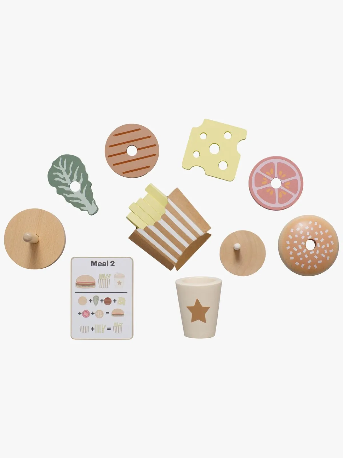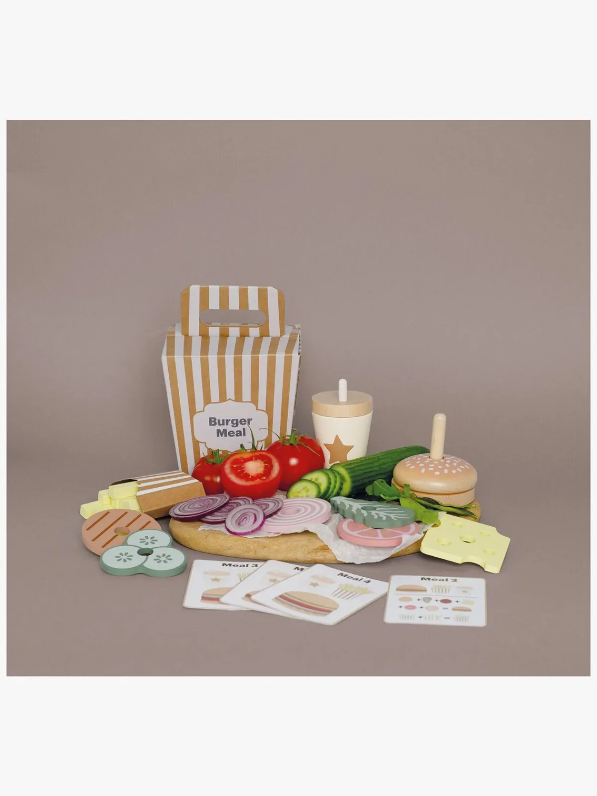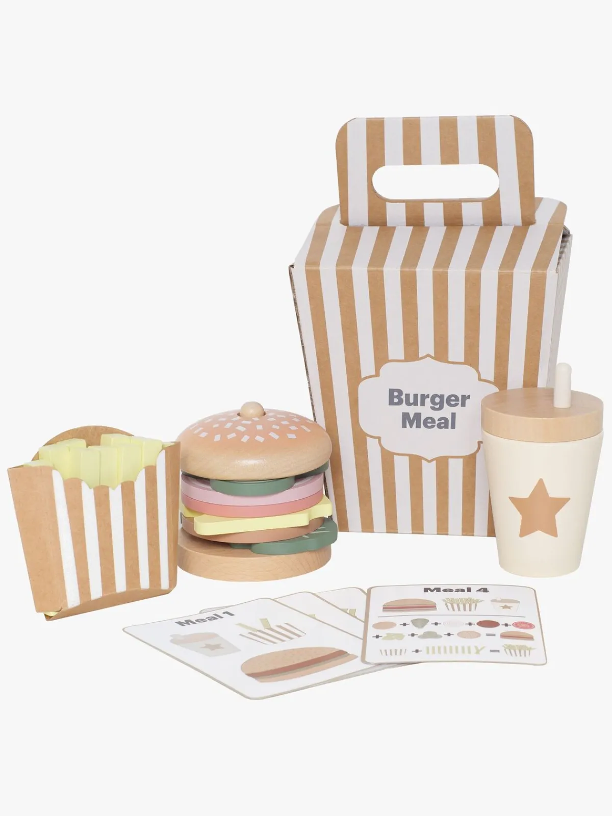 – Indeholder: 1 bærbar take away-boks, 1 stabelbar hamburger med brød, agurk, hamburger, ost, tomat og salat, 1 pakke pomfritter og 4 menukort.