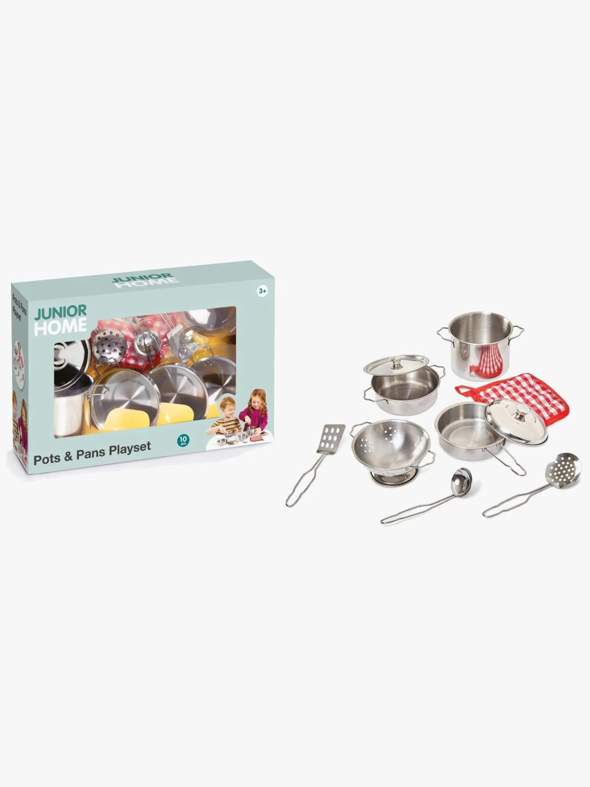 – Indeholder: 2 gryder med et låg, 1 pande med et låg, 1 si, 3 køkkenredskaber, 1 grydelap.