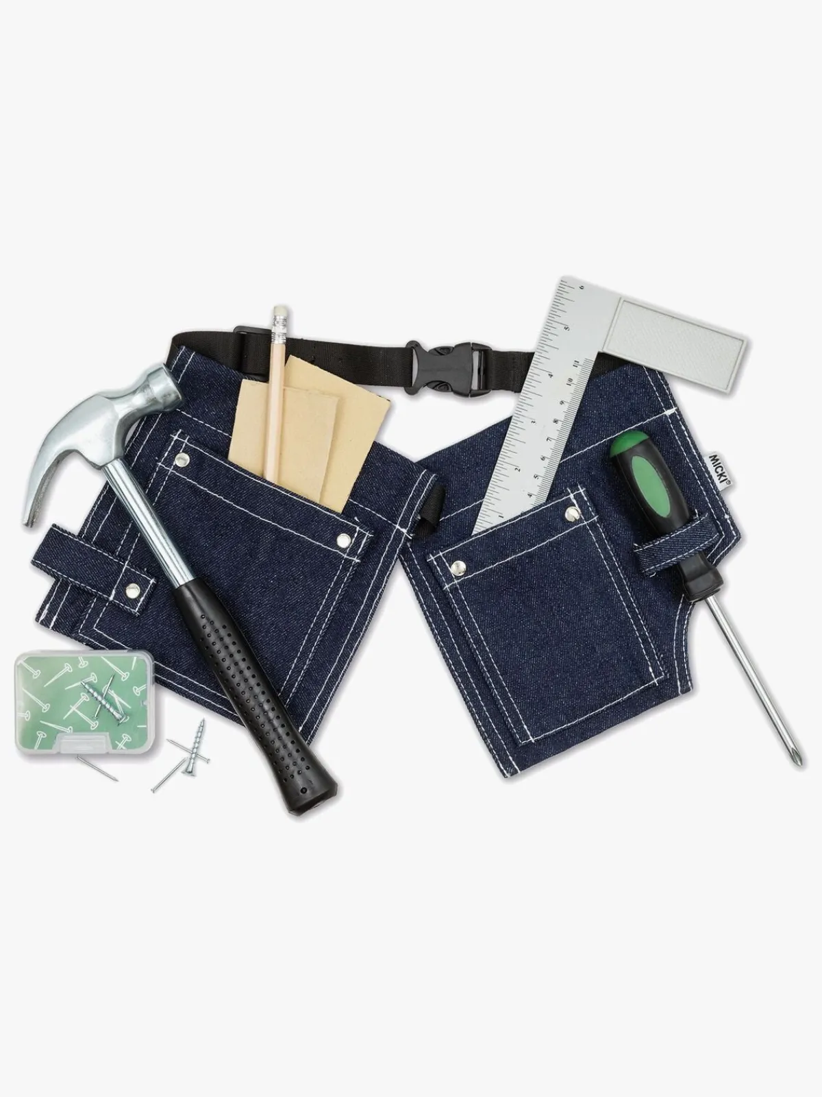 Med bæltet får du: hammer, skruetrækker, vinkelmåler, blyant, sandpapir og en pakke med søm og skruer.