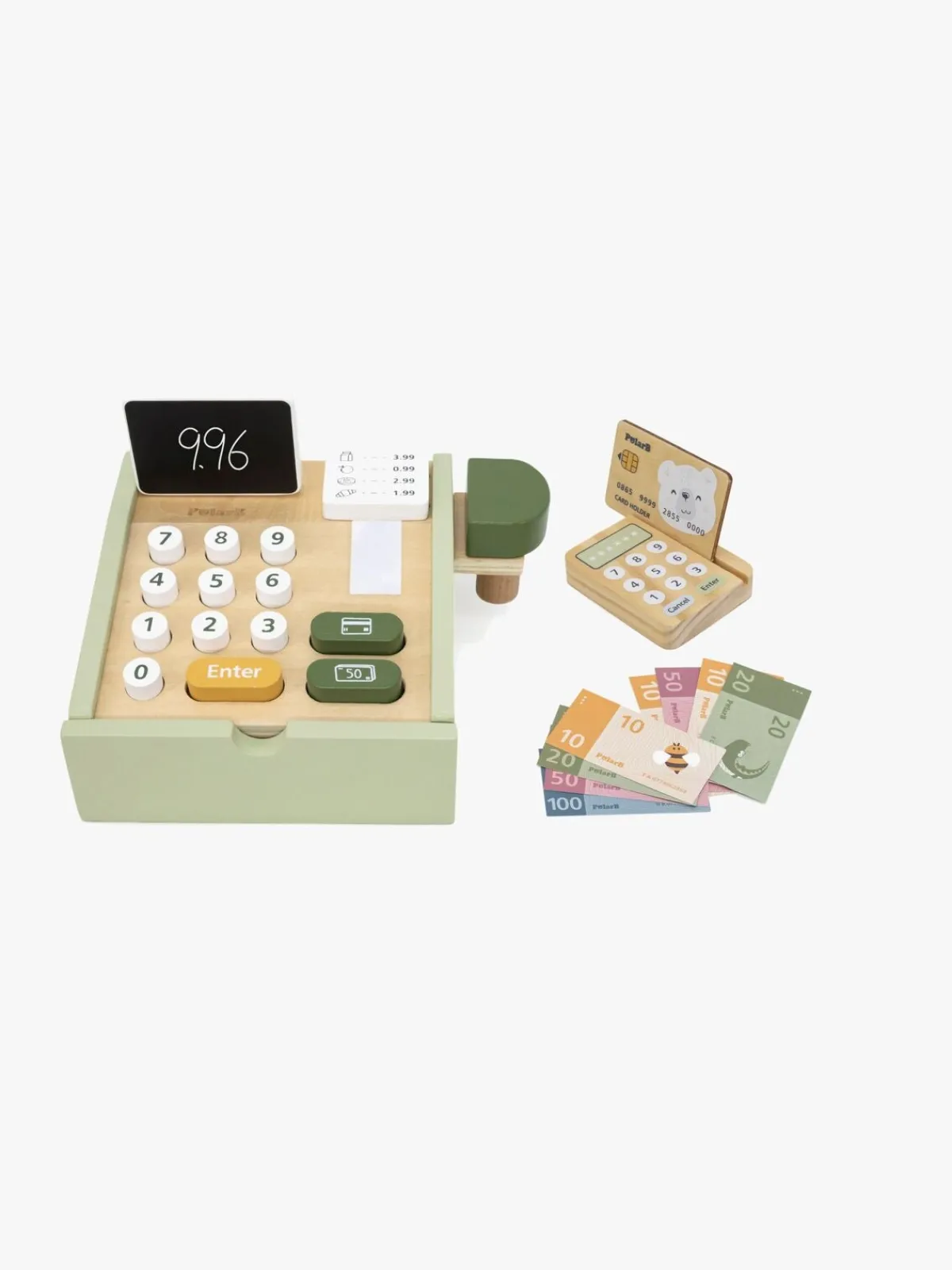 – Indeholder: 1 kasseapparat, 1 scanner, 1 kortlæser, 1 kreditkort, 8 legetøjspengesedler, 14 legetøjsmønter.