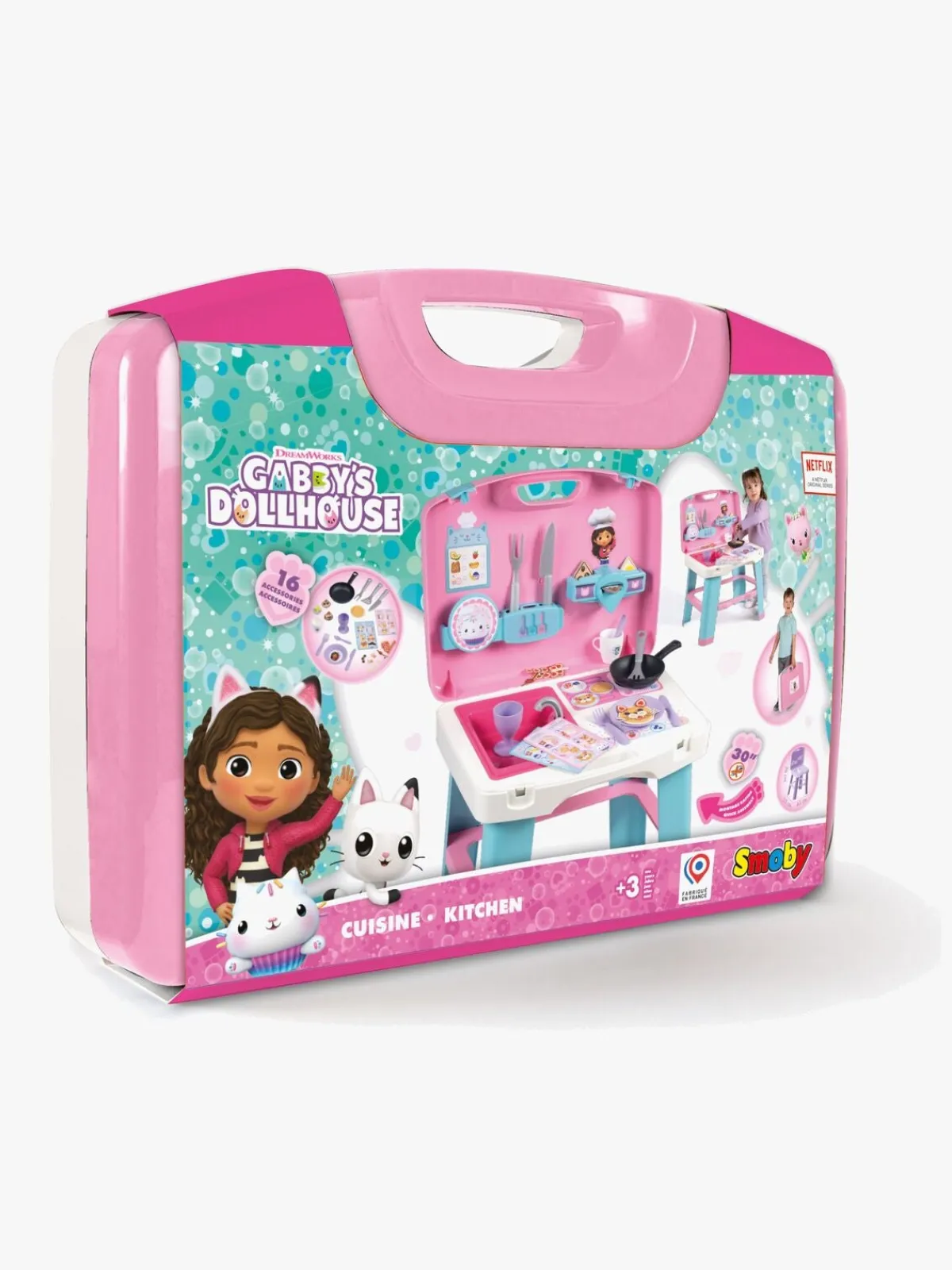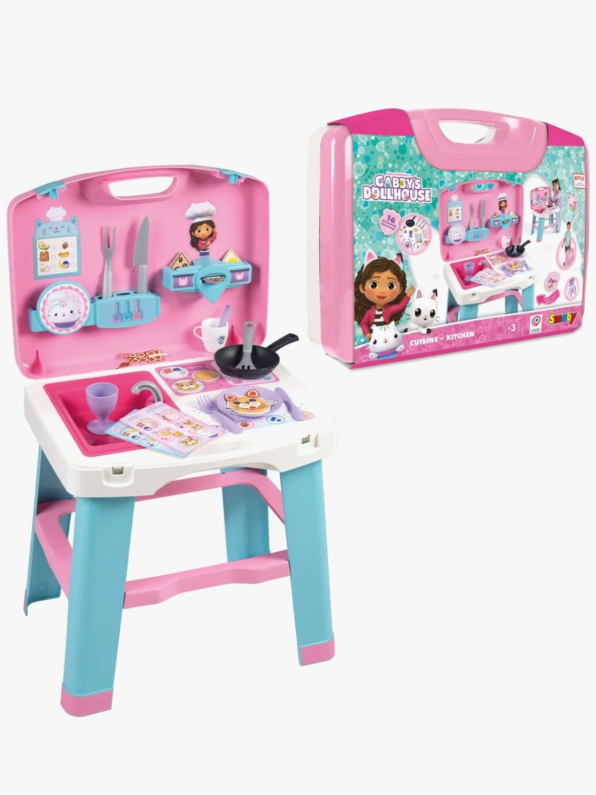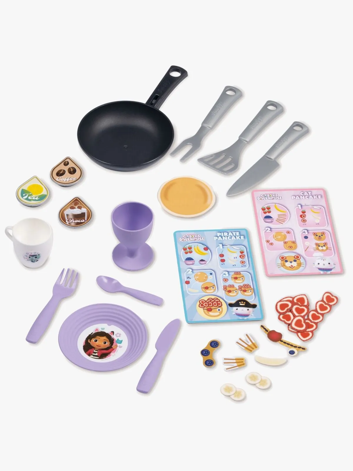 – Indeholder: 1 køkken, 1 stegepande, 1 pandekage, 1 kop, 3 kapsler, 3 køkkenredskaber, 1 tallerken, 1 bestiksæt, 2 opskriftskort, 1 fremstillet af glas.