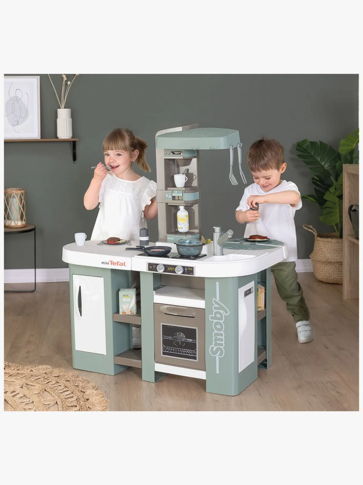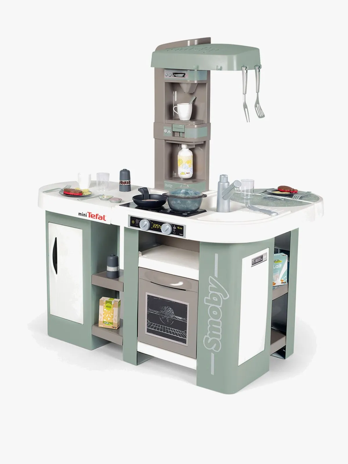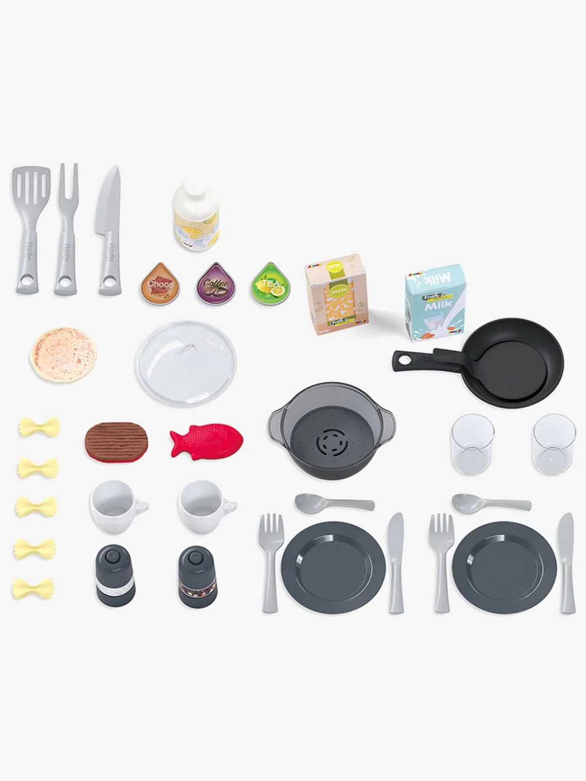 – Indeholder en stegepande, et spisesæt og forskelligt legemad og tilbehør til køkkenet.