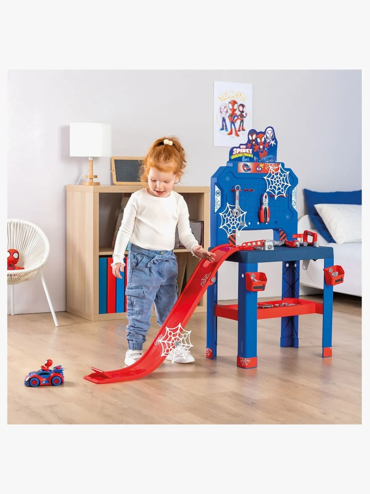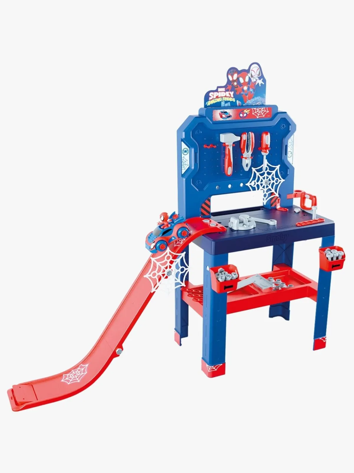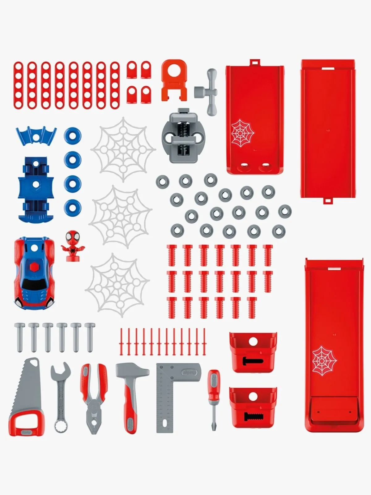 – Indeholder: 1 arbejdsbænk, 2 opbevaringskasser, 6 værktøjer, 6 byggeplader, 20 skruer, 1 Konstruerbart køretøj, 1 karakter.