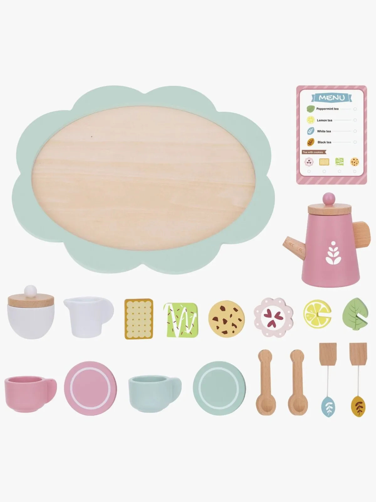 – Indeholder: 1 tepotte, 2 tallerkener, 2 tekopper, 2 skeer, 1 mælkebeholder, 1 sukkerskål, 1 bakke.