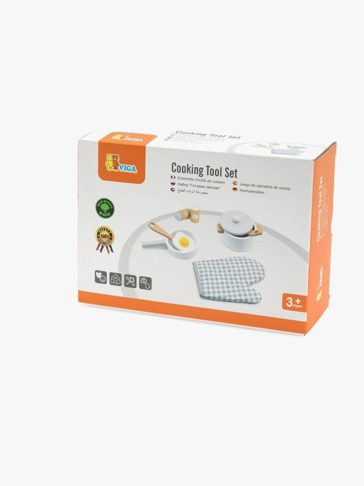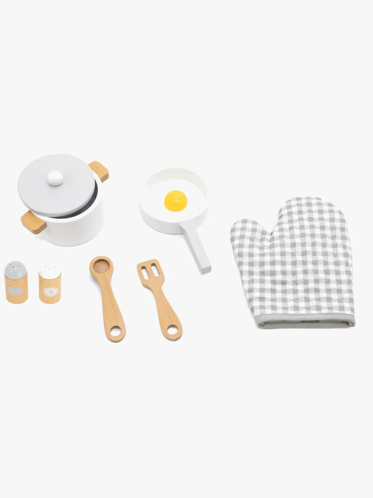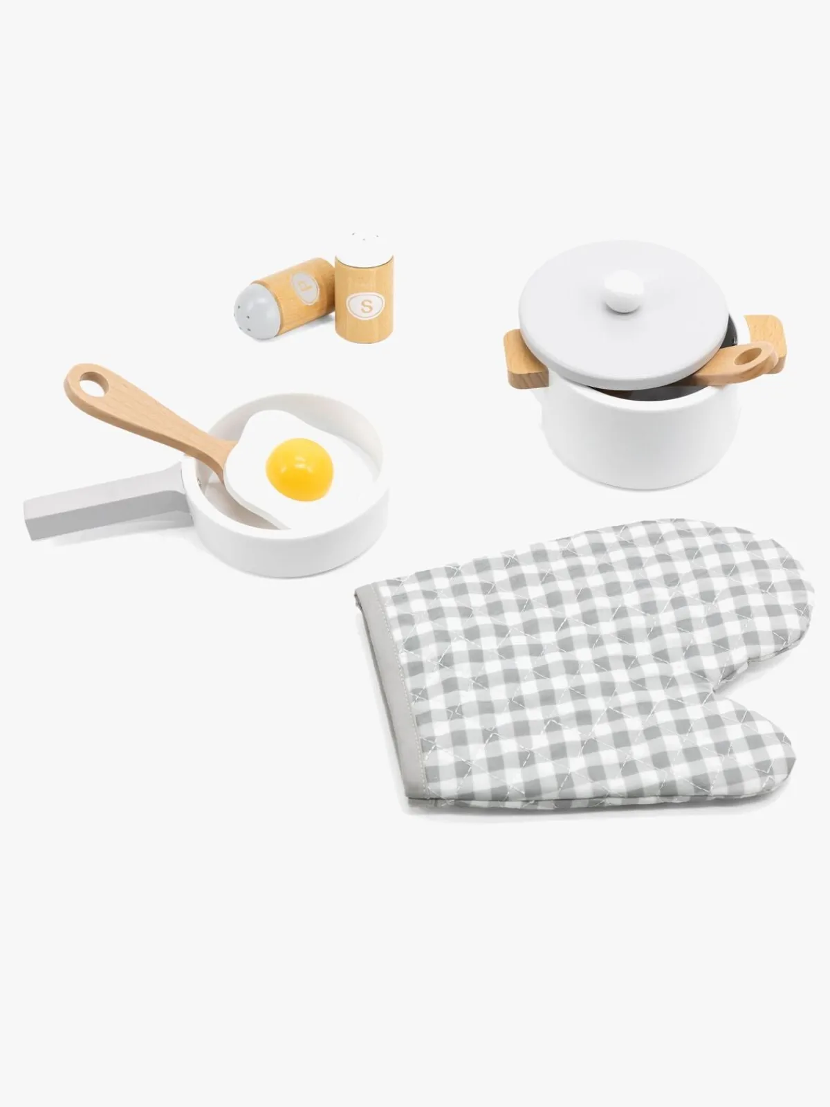 – Indeholder: 1 kasserolle, 1 stegepande, 1 æg, 1 salatskål, 1 peberkværn, 1 ske, 1 grydevante.