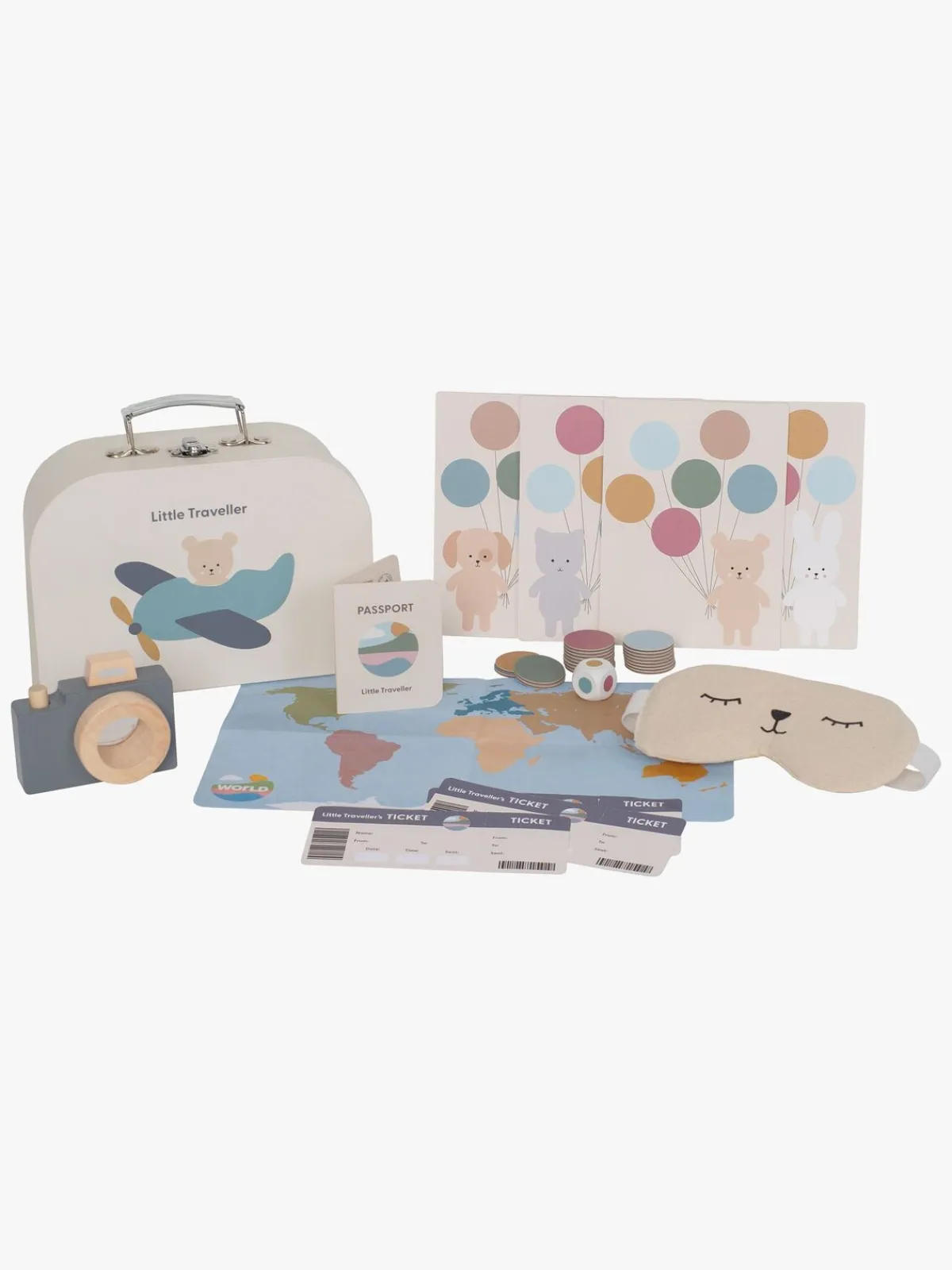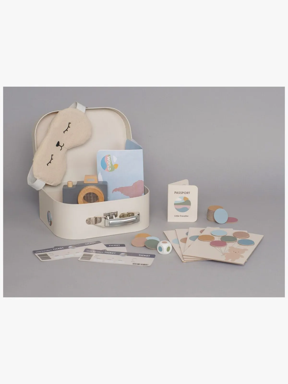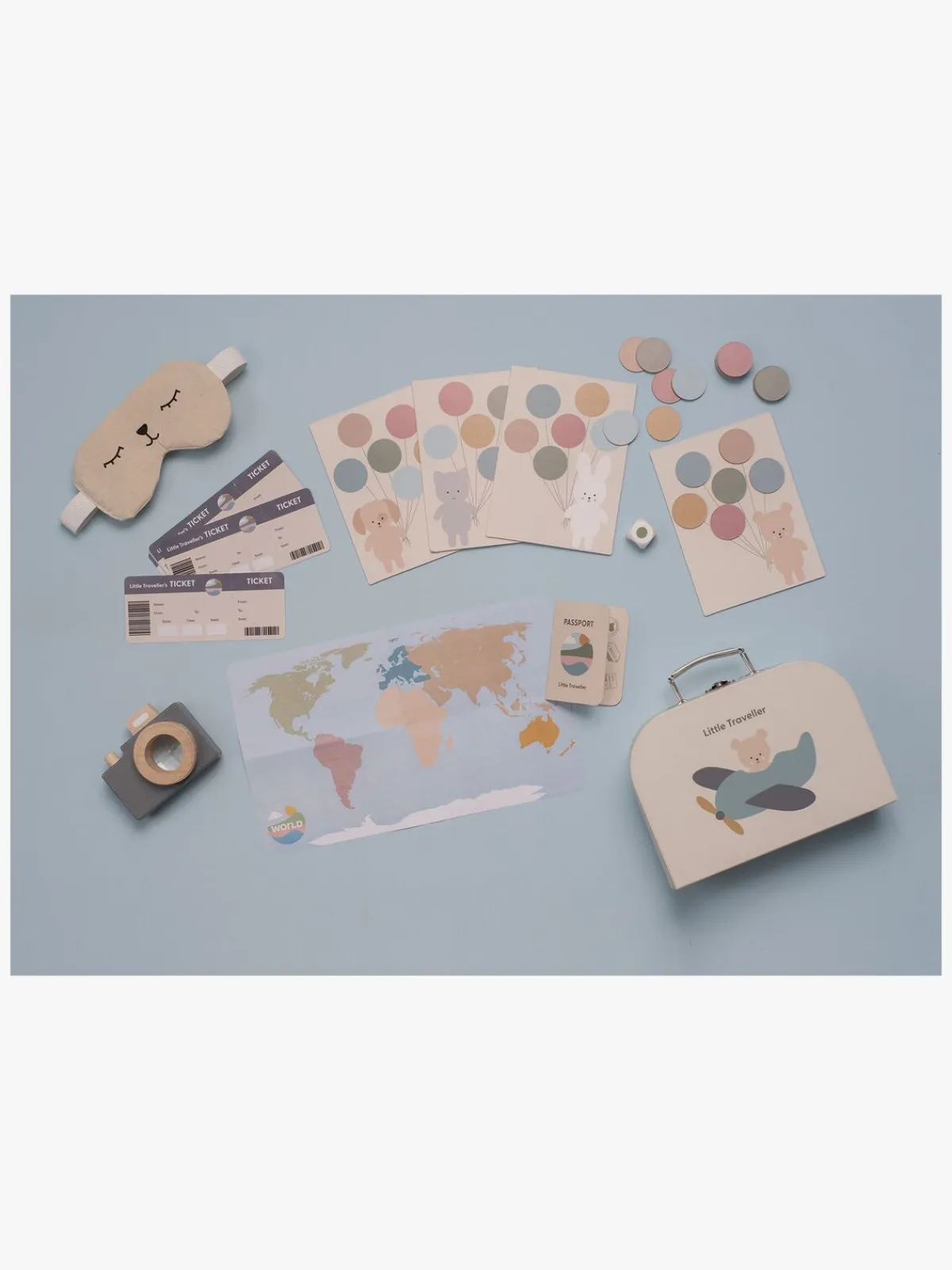 – Indeholder: 1 kuffert, 1 pas, 3 billetter, 1 kamera med prisme, 1 sovemaske, 1 verdenskort, 4 spillebrikker, 24 farvede brikker til spillet, 1 terning.