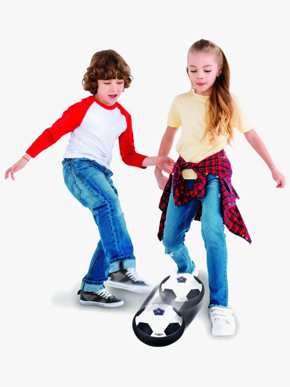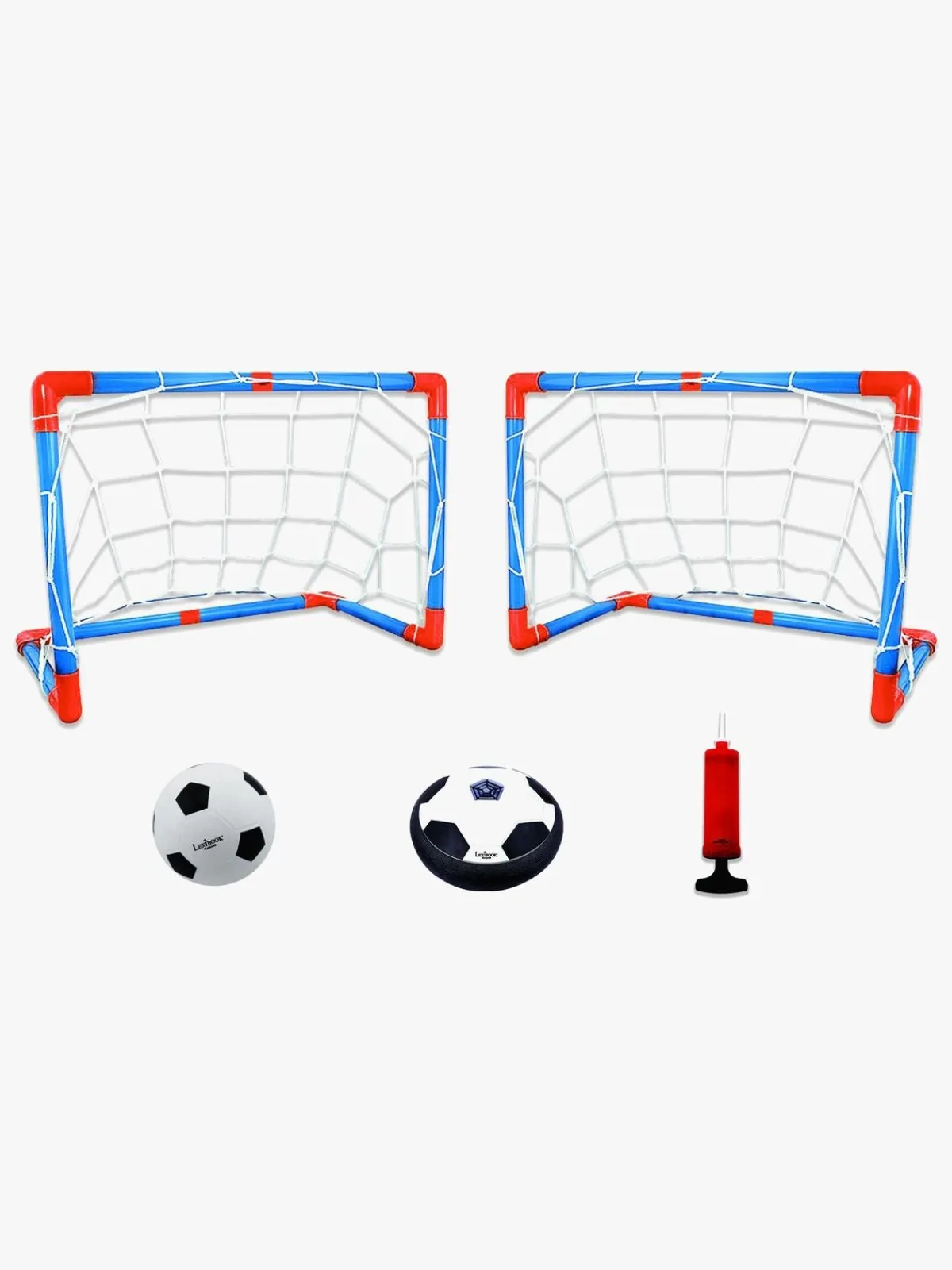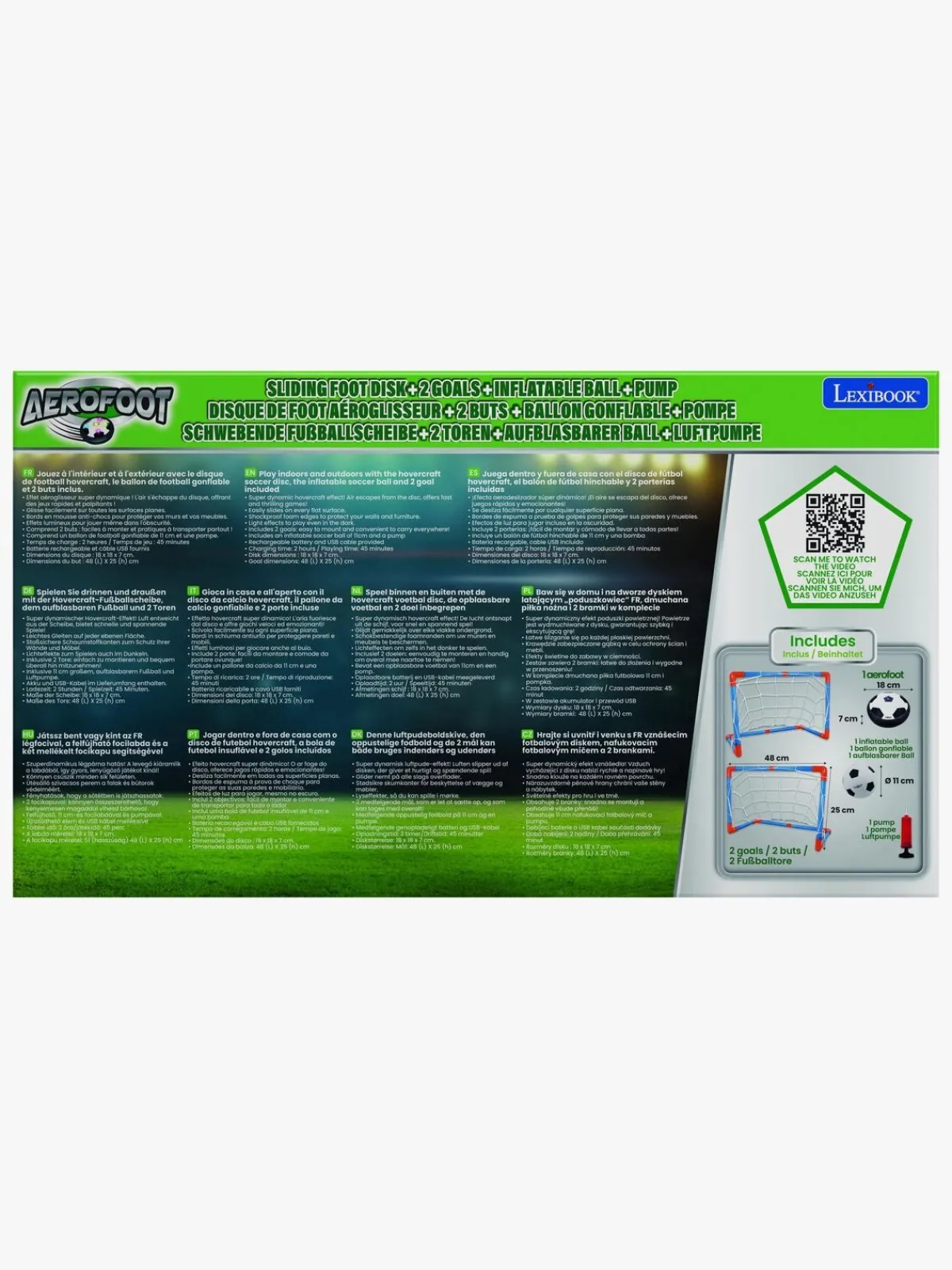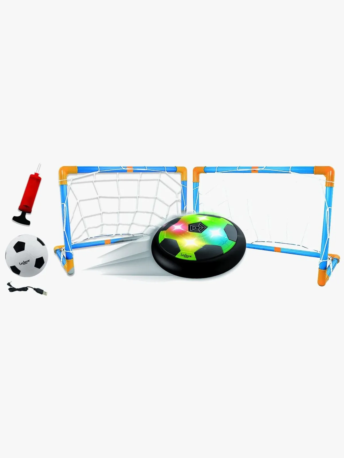– Indeholder: 1 fodbold-disc, 2 mål, 1 oppustelig bold, 1 pumpe, 1 USB-kabel.