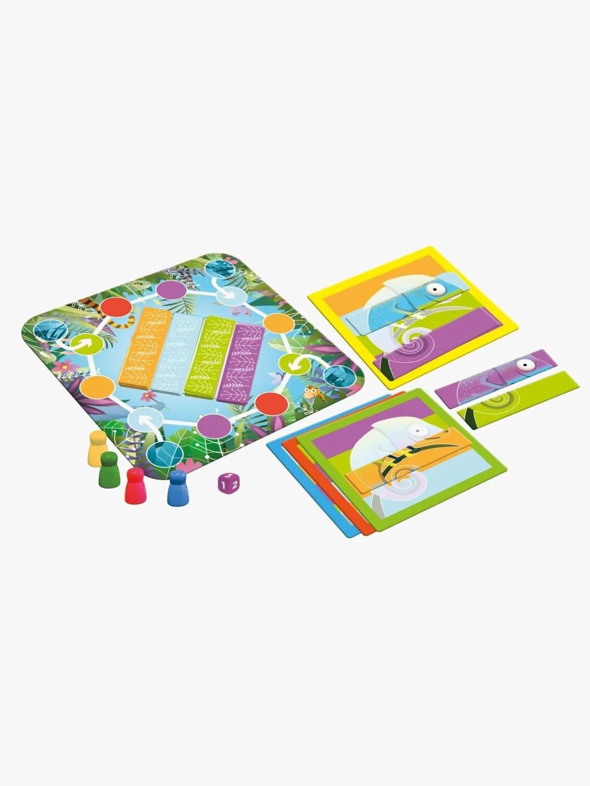 – Terning og store spillebrikker i træ.