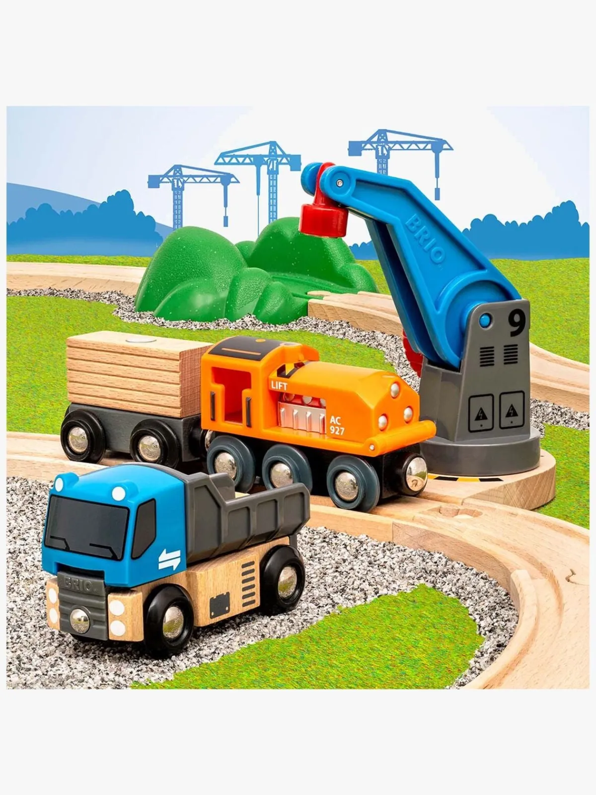 – Indeholder: 1 løftekran, 1 lastbil, 1 godstog med vogn, 8 togskinner og meget mere spændende tilbehør.