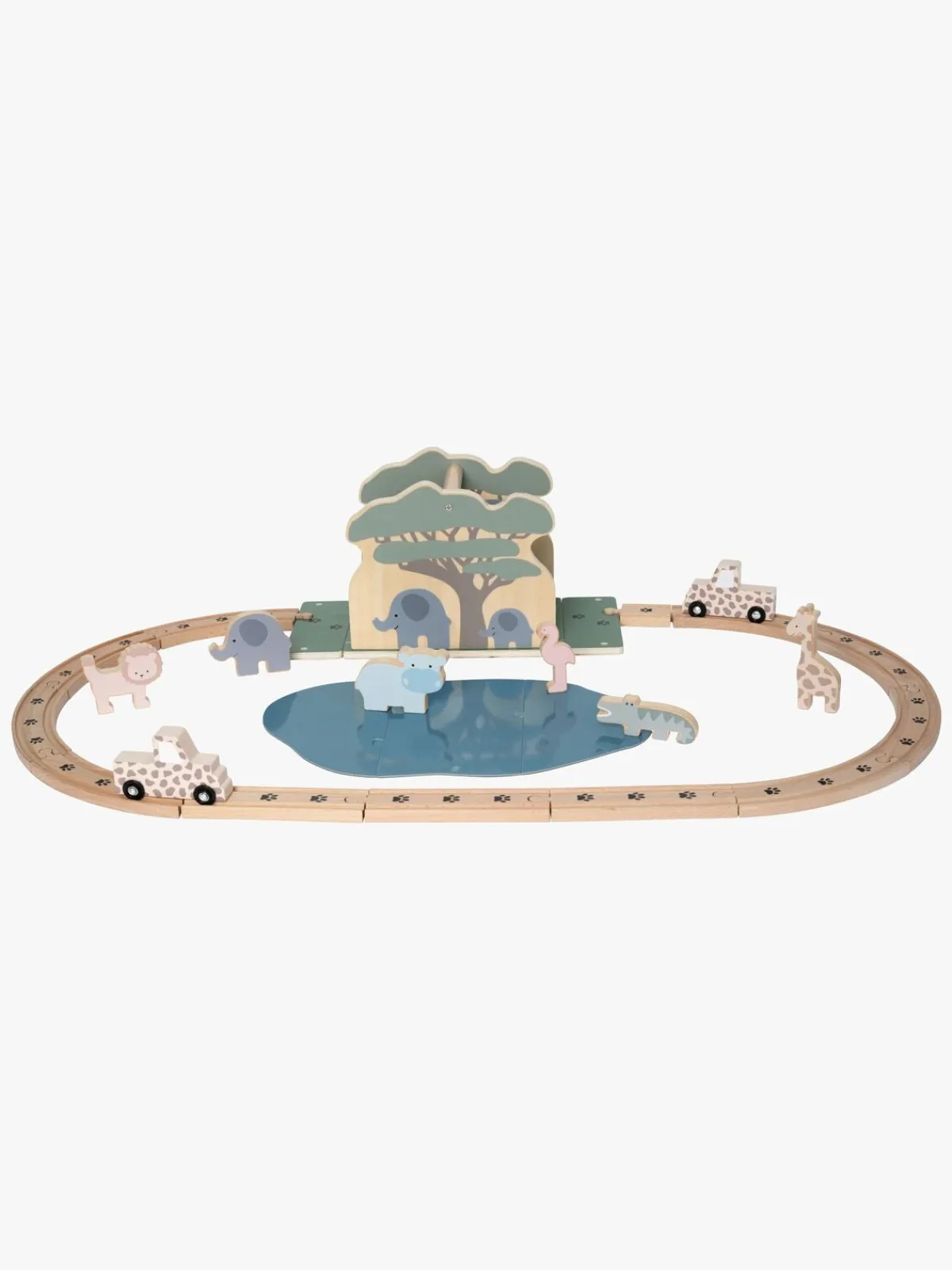 – Indeholder: 1 togbane med safaritema, 2 safaribiler, 6 safaridyr, 1 vandhul.