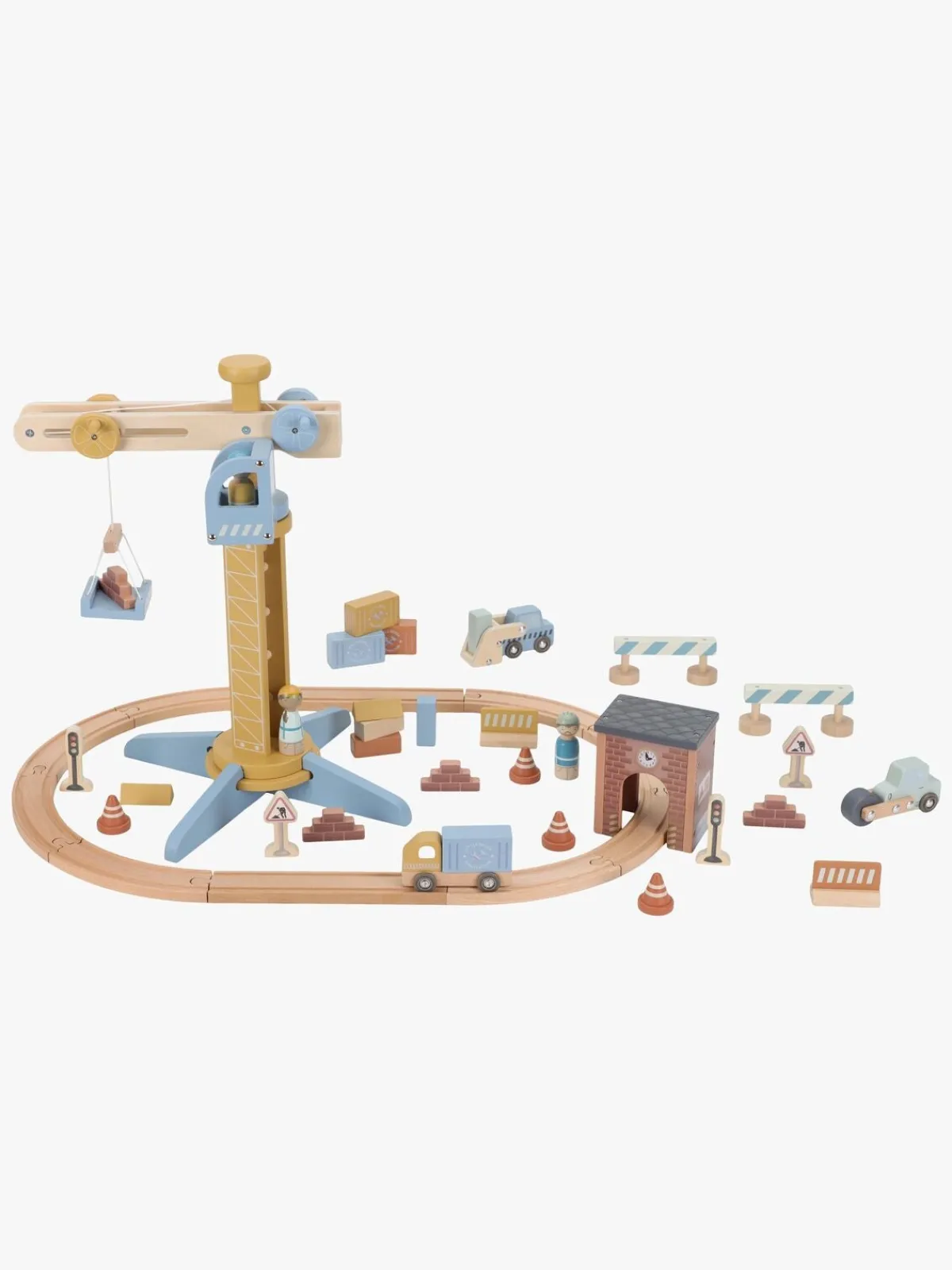 – Indeholder: 1 togbanesæt med en bevægelig kran og en masse sjovt tilbehør.