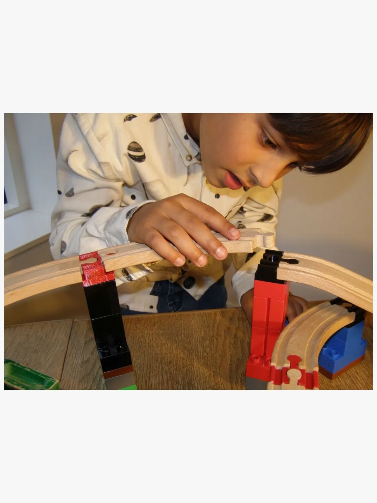 Forbinder DUPLO®, BioBUDDi og modsvarende med trætogskinner fra BRIO®, Thomas Tog, Ikea m.fl.